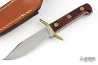 This W43 Mini Bowie by Western Cutlery features a bowie blade with a false top edge, .126" blade stock and .830" blade depth, full tang construction. The handle has a brass s-guard, wood scales with brass pins. Comes with a brown leather sheath. Has some light scratches, excellent condition.