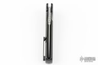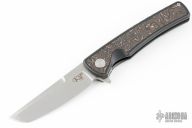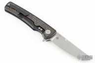 This Shard Integral by Mechforce is a Paul Tony Kilby design. It features a stonewashed tanto blade with false top edge, notched thumbrest and a flipper. The handle has a black PVD integral titanium frame with copper foil carbon fiber inlays, tip up titanium clip, stainless lockface insert, lanyard pin in the butt. Nice detent, lockup and blade seating. Comes with original box. New from maker!