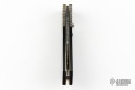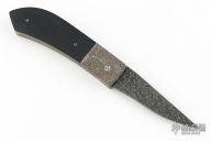 This automatic by Ralph Turnbull features a Damascus clip point blade. The handle Damascus bolsters, file worked titanium liners, stainless standoff, blued Damscus spacer, and paper micarta covers. Also has safety and stainless release button. Has some light scratches on the blade and some wiggle room in the button, open/close. Great condition otherwise.