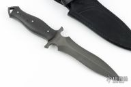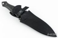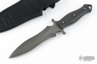 This Dagger from the Sobral brothers features a distressed K720 blade with .219" blade stock, 1.526" blade depth, and full tang construction. The handle carbon fiber scales and stainless steel pins. Comes with a black leather sheath and a padded/zippered case. Has a couple very light scratches, otherwise excellent condition.