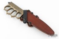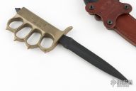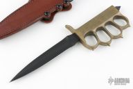 This MK1 Trench Knife by Les George features a black Cerakote double edged blade with .190" blade stock, .998" blade depth, hidden tang construction. The handle has a cast brass knuckle guard grip with a skull crusher. Comes with a brown leather scabbard by Chattanooga Leatherworks. Comes with a zippered case. Excellent condition.