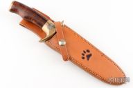 This Tiger Bowie features a Damascus blade with a false top edge, .193" blade stock and 1.301" blade depth, hidden tang construction. The handle has an evgraved copper guard with an ironwood grip and copper butt. Comes with a black leather sheath with belt stud. Has a few light scratches and some patina, otherwise excellent condition.