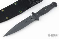 This is Prototype Dagger by Todd Begg has a sniper gray coated double edged blade with fullers, .189" blade stock and 1.257" blade depth, full tang construction. The handle black G-10 scales. Comes with a black leather sheath, not original but fits nicely. Has a couple light scuffs, otherwise excellent condition.