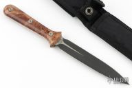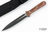 This Dagger from Pro-Tech Knives is a Walter Brend design, it features a black finished double-edged blade and a full tang construction, .163" blade stock and .947" blade depth. The handle has maple burl scales. Includes kydex lined nylon sheath with belt loop. Has some light scuffs, otherwise excellent condition.