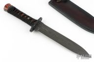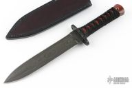 This Dagger by Dawson Select features a Damascus double edged blade, .235" blade stock and 1.522" blade depth, full tang construction. Handle has wood scales with black Japanese style wrap, black steel guard with filework. Comes with a black leather sheath. Has some oxidation on the guard, otherwise excellent condition. #001 and dated 2018.