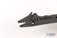 The full tang/integral design maximizes the strength of the high-impact, abrasion-resistant carbon steel throughout the tool. Notice the graduated pry tip butt, a functional feature that proves its mettle. The layered G-10 handle scales are custom contoured, adorned with traction ridges across the entire surface to ensure a secure grip, even in demanding conditions.