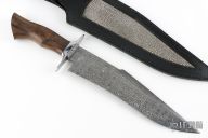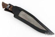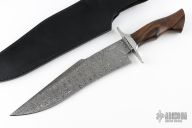 This knife by Benjahmin Knives features a Damascus blade with false top edge, .211" blade stock and 2.285" blade depth, hidden tang construction. The handle has a polished stainless steel guard with a fileworked Damascus collar, dark wood grip. Comes with a black leather sheath with rayskin inlay. New from maker.