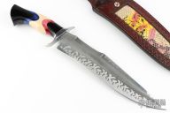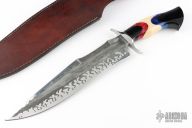 This knife by Benjahmin Knives features a recurve blade with false top edge, the blade is acid etched with a simulated hamon, .208" blade stock and 2.231" blade depth, hidden tang construction. The handle has a polished stainless steel guard with a multi-color acrylic grip. Comes with a brown leather sheath with snakeskin inlay. New from maker.