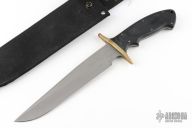 This Kasper Grande by Rob Patton features a bead blasted, double edged clip point blade with 0.190" blade stock and 1.480" blade depth. The handle is comprised of a blasted brass guard and micarta scales with brass pins and lanyard tube over full tang construction. Some sheath marks in blade finish but otherwise great condition. Includes nylon belt sheath.