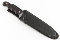 The Model 1 is machined from a solid bar of D2 steel then ground by hand. It is solid from the tip to the butt including the double guard. 1/4" blade thickness and 1 1/4" blade depth. False top edge. The handle has pinned micarta scales. Includes a nice leather sheath with elephant panel. Has some scuffs and scratches, great condition otherwise.