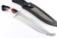 This knife by Benjahmin Knives features a nearly mirror polished blade with false top edge, .210" blade stock and 2.309" blade depth, hidden tang construction. The handle has a polished stainless steel guard with a multi-color acrylic grip. Comes with a black leather sheath with ray skin inlay. New from maker.