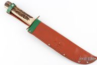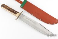 This Bowie by Edge Mark features a satin finished blade with false top edge, .232" blade stock and 1.893" blade depth, full tang construction. The handle has a brass guard with stag grip. Comes with brown leather sheath. Has some scuffs, scratches, and patina. Great condition otherwise.
