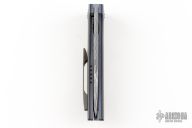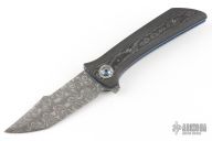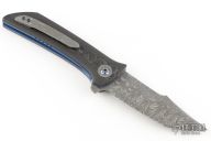 This Shuck flipper from John Barker features a Damascus tanto blade with swedge and notched flipper. The handle has carbon fiber scales over anodized titanium liners with Damascus pivot collars, tip up pocket clip and floating backspacer.  Includes a padded case.  Excellent Condition.