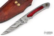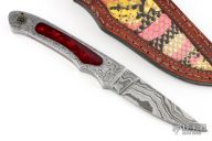 This Knife by SMID Damascus features a Damascus blade with .165" blade stock and .879" blade depth, integral bolsters with full tang construction. The handle has inlays and mosaic pin at the pommel. Comes with a hand tooled brown leather sheath. New from maker.