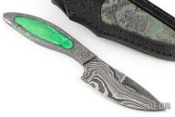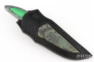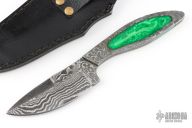 This Knife by SMID Damascus features a Damascus blade with .165" blade stock and .879" blade depth, integral bolsters with full tang construction. The handle has green inlays. Comes with a hand tooled brown leather sheath. New from maker.