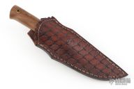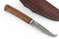 This Knife by SMID Damascus features a Damascus blade with .157" blade stock and .831" blade depth. The handle has a stainless collar, red spacer, and wood grip with lanyard hole in pommel. Hidden tang construction. Comes with a hand tooled brown leather sheath. New from maker.