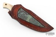 This Knife by SMID Damascus features a Damascus blade with .190" blade stock and 1.141" blade depth, integral bolsters with full tang construction. The handle has pinned bone overlays with lanyard hole in pommel. Comes with a hand tooled brown leather sheath. New from maker.