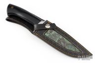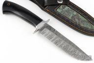 This Knife by SMID Damascus features a Damascus blade with .194" blade stock and 1.412" blade depth and hidden tang construction. The handle has a steel guard with contoured micarta grip and lanyard hole in pommel. Comes with a hand tooled brown leather sheath. New from maker.