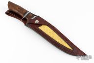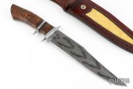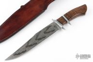 This Knife by SMID Damascus features a Damascus blade with sharpened top edge, .134" blade stock and 1.65" blade depth and hidden tang construction. The handle has a steel guard, and sub hilt with wood grip and lanyard hole in pommel. Comes with a hand tooled brown leather sheath. Has some light oxidation.  New from maker.
