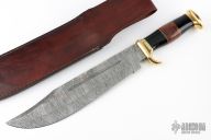 This Knife by SMID Damascus features a Damascus blade with false top edge, .173" blade stock and 2.445" blade depth and hidden tang construction. The handle has a brass guard and butt, with stacked leather and horn grip Comes with a hand tooled brown leather sheath. New from maker.