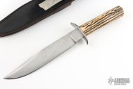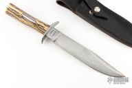 This Stag handled bowie from Master Smith Bill Bagwell features a Damascus clip point blade with sharpened top edge, .343" blade stock at the ricasso and 1.415" blade depth, hidden tang construction. The handle has a steel guard and stag grip with steel escutcheon. Includes a black leather sheath. Has a couple light scratches, otherwise excellent condition.