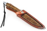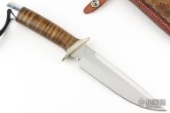 This knife by Rodney Rogers features a mirror polished blade with a sharpened top edge, .166" blade stock and 1.328" blade depth, hidden tang construction. The handle has a nickel silver guard and an aluminum butt with a curly maple wood grip, black and aluminum spacers, lanyard hole. Comes with a brown leather sheath with snake skin inlay. Excellent condition.