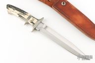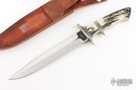 This Sub-Hilt Fighter by WC Davis features a mirror finished clip point blade with sharpened top edge, .232" blade thickness and 1.289" blade depth, full tapered tang construction. The handle has a nickel silver guard and sub-hilt, stag scales with nickel silver pins and lanyard hole. Comes with brown leather sheath. Excellent condition.
