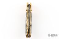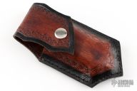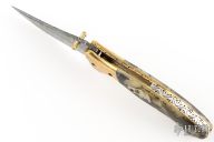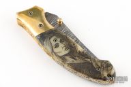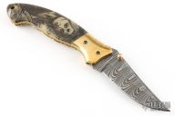 This linerlock by Smid Damascus features a Damascus clip point blade with dual brass thumb studs, file worked brass liners, bolsters, and scrimshaw bone handles. Comes with hand tooled leather belt sheath. New from maker!