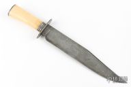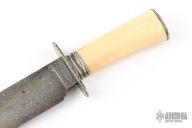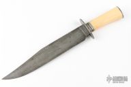 This Bowie by Master Smith Keith Kilby features a clip point Damascus blade with false top edge, .210" blade stock and 1.744" blade depth, hidden tang construction. The handle has a fileworked Damascus, fluted steel collar, fossil walrus ivory grip with a fileworked steel butt. Excellent condition.