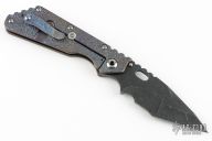 This Unique One-Off Custom XL by Mick Strider has a Dark Finished Handground Nightmare Grind MagnaCut Blade. The Double Sided Titanium Handles are individually textured, colored and finished by Mick.  It features a reversible clip option and comes in a SOE zipper pouch.