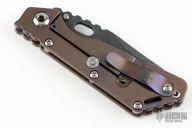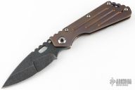 This Custom SMF by Mick Strider has a Hand Ground Dark Finished Nightmare Grind MagnaCut Blade. The Hand Finished and Heat Colored Handle is a dual side Peeled Titanium with Raw Titanium Hardware. It comes in a new version Made In USA Strider FWP logo Pouch.