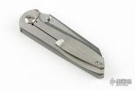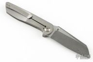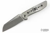 This Unnamed Sheepsfoot Integral by Maverick Concepts features a Chad Nichols Ripple Damascus blade with dual thumbstuds. The handle has a two-tone integral titanium frame with black Carboquartz inlays, tip up titanium clip, Carboquartz inlaid pivot screw. Comes with a COA dated 1/18/22 and original case. #23. Excellent condition.