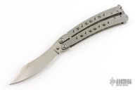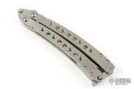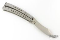 This Scimitar Balisong features a satin finished up swept clip point blade. The handles are satin finished titanium with a matching spring latch and pacers. One of three prototypes made before the maker's passing. Marked "Proto B" and "Marcuzzo" on the blade spine. Comes with zippered case. Has a couple light scuffs, otherwise Excellent condition.