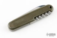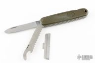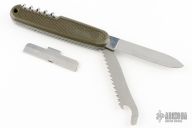 This Bundeswher from Victorinox was made for the West German army and was discontinued in 2003. Itfeatures a spear point blade with nail nick. The knife also includes a wood saw, cork screw, bottle opener, flat head screw driver and an awl. The handle has green covers over stainless steel backsprings and aluminum liners. Lanyard hole. Has some scratches, otherwise good condition.