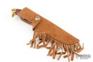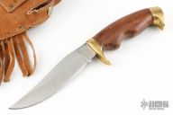 This knife by Jay Jacobs features a satin finished blade with .191" blade stock and 1.045" blade depth, hidden tang construction. The handle has a brass guard and butt, wood grip. Comes with a brown leather sheath. Has some scratches, otherwise good condition.