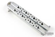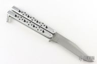 This balisong by Herb Whitmore has a satin finished clip point blade with a false top edge. The handles are aluminum with t-latch. Has scratches on the blade and handles. Good condition otherwise.