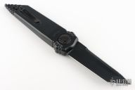 This Dreddlock model sports a black handle with a bullseye laser etching and a CPM-S30V steel blade with a black cerakote finish. The top edge of the knife has been sharpened.