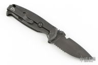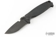 This HEST/F Triple Black from DPx features a black coated drop point partially serrated blade with bottle opener, dual thumb studs and notched thumb rest that doubles as wire strippers. The handle is comprised of textured black G10 scale and black titanium lockside over a black polymer backspacer. Black steel pocket clip. The lockside features a "Roto-Lok" lockbar stabilizer that can be rotated to turn the knife into a virtual fixed blade. Comes with original box. Has some light scuffs, otherwise excellent condition.