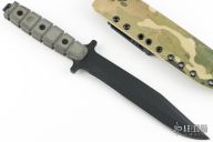 Blade has a black coated and is 1/4" thick and 1 3/8" deep. Full tang construction. Black linen micarta ribbed handle with red liners. Comes with a custom Kydex sheath. Excellent condition.