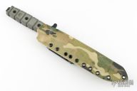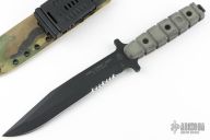 "The USMC Combat knife, a TOPS Knives production, was designed by Laci Szabo, a well-known knife aficionado and designer. His prior service in the Marine Corps was instrumental in his creation of the USMC Combat Knife. Keeping his design within the basics of use, form and fit he used standards which makes this knife a positive step forward in hard core use, not only for the military, but a great general use outdoor tool. The full-tang construction and a well thought out handle shape, this knife has been taken into the field and been used and abused. It received "A" grade results all around. All the guys that have had this knife in their hands have been very impressed with the great feel of power, outstanding wet gripping and solid weight with positive performance."