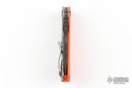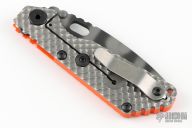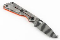 This SNG GG by Strider has a tiger stripped spear point blade with dual thumb studs, thumbhole, and notched thumb rest. Handle is orange G10 and titanium frame, with lockbar stabilizer and a matching tip up clip. Nice detent, lockup and blade seating.  New Condition.