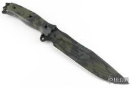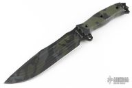 This Hell Razor 2 from Busse features a black/green camo coated blade with fullers and black/green camo canvas micarta scales, .213" blade thickness and 1.790" blade depth, full tang construction. Has large fullers on blade and corrugated bevel technology. Excellent condition.