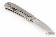 This Trapper Front Flipper by Enrique Pena features a satin finished blade with a front flipper and notched thumbrest. The handle has a titanium frame with EDC Texture, matching backspacer and tip up pocket clip. Includes original box and accessories. Excellent condition.