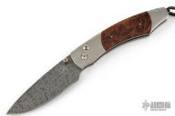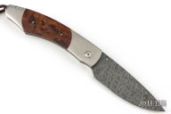 This folder features a titanium frame with wood scales. Citrine inlays in thumb stud and push button. The push button releases the lock and allows you to close the knife. The drop point blade is composed of Damascus.  Includes a leather slip sheath.  Excellent Condition.