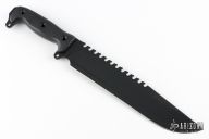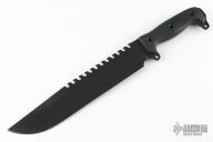 This Battle Saw by Busse Knives has a black coated blade with corrugated bevel technology, 11 saw teeth on the spine, large finger choil, .235" blade stock, 2.097" depth, full tang construction. The handle has black G-10 scales, exposed butt tang with lashing points. Excellent condition.