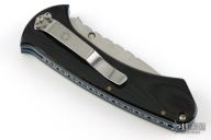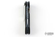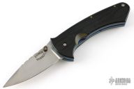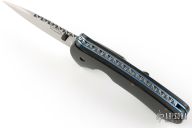 This linerlock folder by Dick Atkinson features a hand rub satin finished blade with single thumbstud and fileworked spine. The handle has micarta scales, anodized titanium liners, tip down stainless steel Spyderco tip down clip, fileworked stainless steel backspacer. Nice lockup, has some light scratches. Excellent condition.