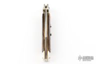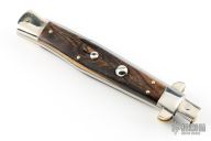 This Picklock Auto by Renzo Passcotto features a tumble polished blade with unsharpened edges. The handle has bulsa wod scales, brass D-stamp liners and nickel silver bolsters. Has safety. Has some light scratches, otherwise excellent condition.