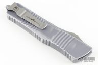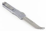 This Combat Troodon OTF automatic by Microtech knives features an Apocalyptic Hellhound tanto blade, and a distressed gray aluminum handle with bead blasted hardware, tip down carry. Glass breaker. Dated 03/2019. Comes with original box and papers. Excellent condition.