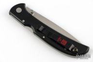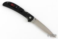 This Eagle Ultralight lock back by Al Mar Knives has a satin finish blade with dual thumb studs and full serrations. Black linen micarta scales and a black pocket clip. Strong lock up. Has some light scratches, otherwise excellent condition.