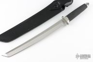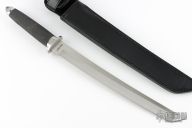 This Magnum Tanto XII by Cold Steel with San Mai VG1 blade in satin finish. Guard and pommel are stainless. .188 blade stock and 1.169" blade depth, hidden tang construction. Handle is textured Kraton for a sure non-slip grip. Lanyard hole and glass breaker. Comes with black leather sheath. Excellent condition.